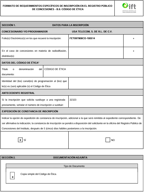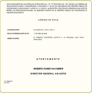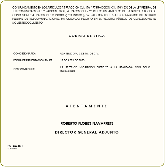 concesionario que cuenta con un Título de Concesión Única para instalar, operar y explotar una Red Pública de Telecomunicaciones, para la prestación de servicios de Televisión y Audio Restringido, de conformidad con el Título que ostenta. El servicio que proporciona USA TELECOM, S. DE R.L. DE C.V. a sus suscriptores es de un sano entretenimiento, estructurado de tal forma que en la programación ofertada se incluya a todos y cada uno de los miembros de la familia mexicana, la cual se conforma de personas de diferentes generaciones, gustos y forma de pensar; en vista de esto USA TELECOM, S. DE R.L. DE C.V. cuenta no sólo con acceso a un sano entretenimiento para toda la familia, ya que pone a su alcance y disposición: series populares, estrenos de cine, grandes eventos deportivos nacionales e internacionales, documentales sorprendentes y producciones originales, programación que estimula no solo el aprendizaje sino también el uso de la imaginación de los pequeños integrantes de la familia; también telenovelas nacionales e internacionales, programas de entretenimiento familiar, nacionales e internacionales, programas musicales, eventos nacionales e internacionales de música y cine y un sin fin de entretenimiento y diversión. USA TELECOM, S. DE R.L. DE C.V. en el ánimo de, no solo entretener, sino de fomentar los valores morales, el amor y respeto a la familia, el amor a la Patria, el respeto a los derechos humanos, la conciencia de solidaridad, la justicia y la libertad, así como fomentar y preservar las tradiciones que, junto con todo lo antes mencionado, conforman la identidad mexicana, que es reconocida en el mundo entero. Aunado a lo anterior, USA TELECOM, S. DE R.L. DE C.V. también cumple con su obligación y derecho al ser concesionario; obligación fundada y motivada por los Artículos 6º y 7º de la Constitución Política de los Estados Unidos Mexicanos, que señala que toda persona tiene derecho inviolable de difundir información e ideas de toda índole por cualquier medio de expresión, así mismo la obligación de dar cumplimiento a lo que toda persona tiene el derecho, que es el libre acceso a la información plural y oportuna, el derecho de acceso a las tecnologías de información y comunicación así como a los Servicios de Radiodifusión y Telecomunicaciones. Luego resulta necesario dejar claro y debidamente establecido que las opiniones e información vertidas en los programas que se retransmiten en la red del servicio de USA TELECOM, S. DE R.L. DE C.V., son de exclusiva responsabilidad de quienes las hacen o de quienes resulten ser los propietarios o propietarios de los canales. Por lo que, el contenido de los programas, no necesariamente representan el pensamiento del concesionario. Entonces, a fin de dar cabal cumplimiento a las reformas de la Ley Federal de Telecomunicaciones y Radiodifusión, publicadas en el Diario Oficial de la Federación en fecha treinta y uno de octubre de dos mil diecisiete, antepenúltimo párrafo del artículo 256 y al ACUERDO mediante el cual el Pleno del Instituto Federal de Telecomunicaciones aprueba y emite los Lineamientos Generales sobre la Defensa de las Audiencias, donde se establece que los concesionarios de Radiodifusión y de Televisión y/o Audio Restringidos deben de contar con un Código de Ética, se pone a disposición de la audiencia del servicio proporcionado por USA TELECOM, S. DE R.L. DE C.V., el presente Código de Ética.